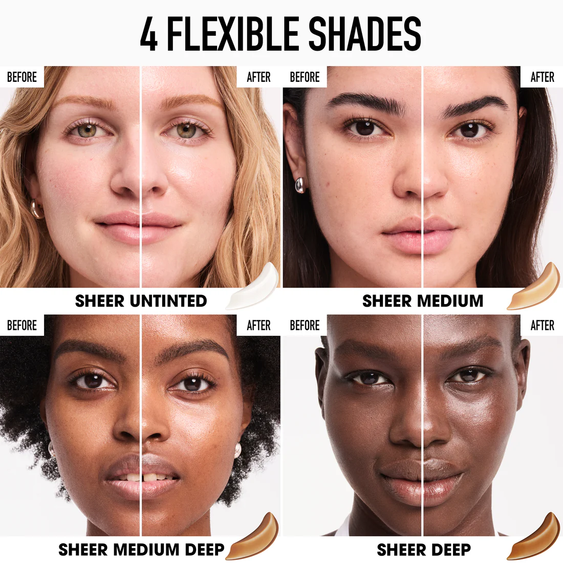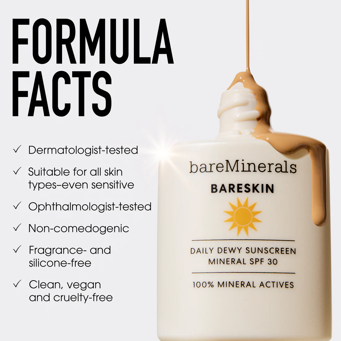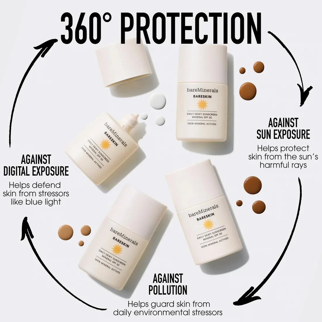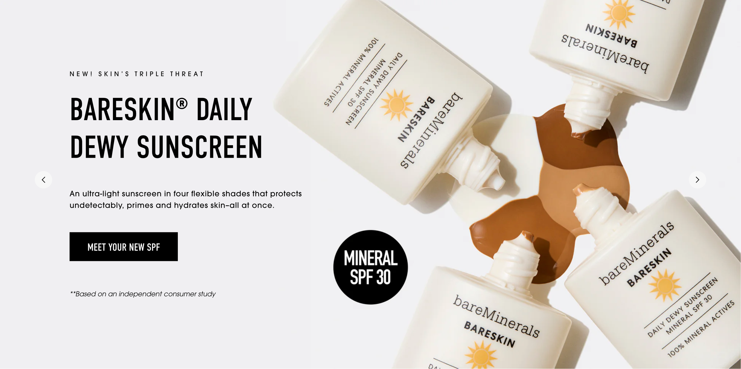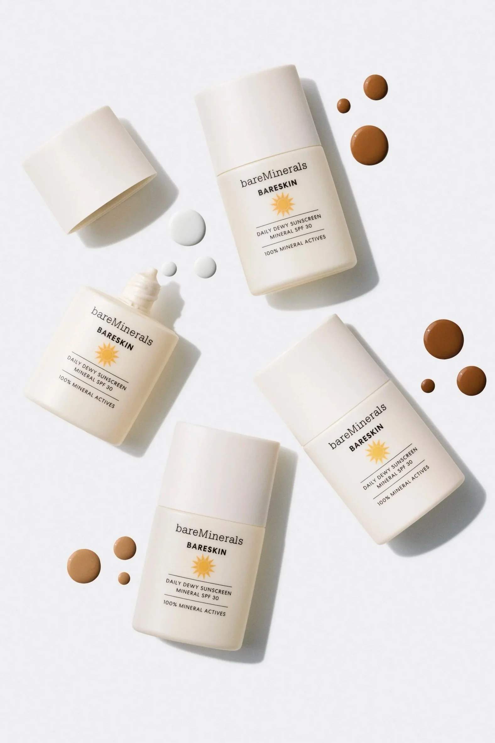The wait is over for a lightweight daily sunscreen that suits all skin tones with no white cast. bareMinerals Bareskin Daily Dewy Sunscreen provides protection and hydration for every day. For both, on figure and still life, we let the sun shine in. Talent was shot in a glowy off-white environment signaling the clean benefits and sunscreen protection of the product. Still life was all about capturing the sheer texture and shade range of the product cast in the same sunny glow.